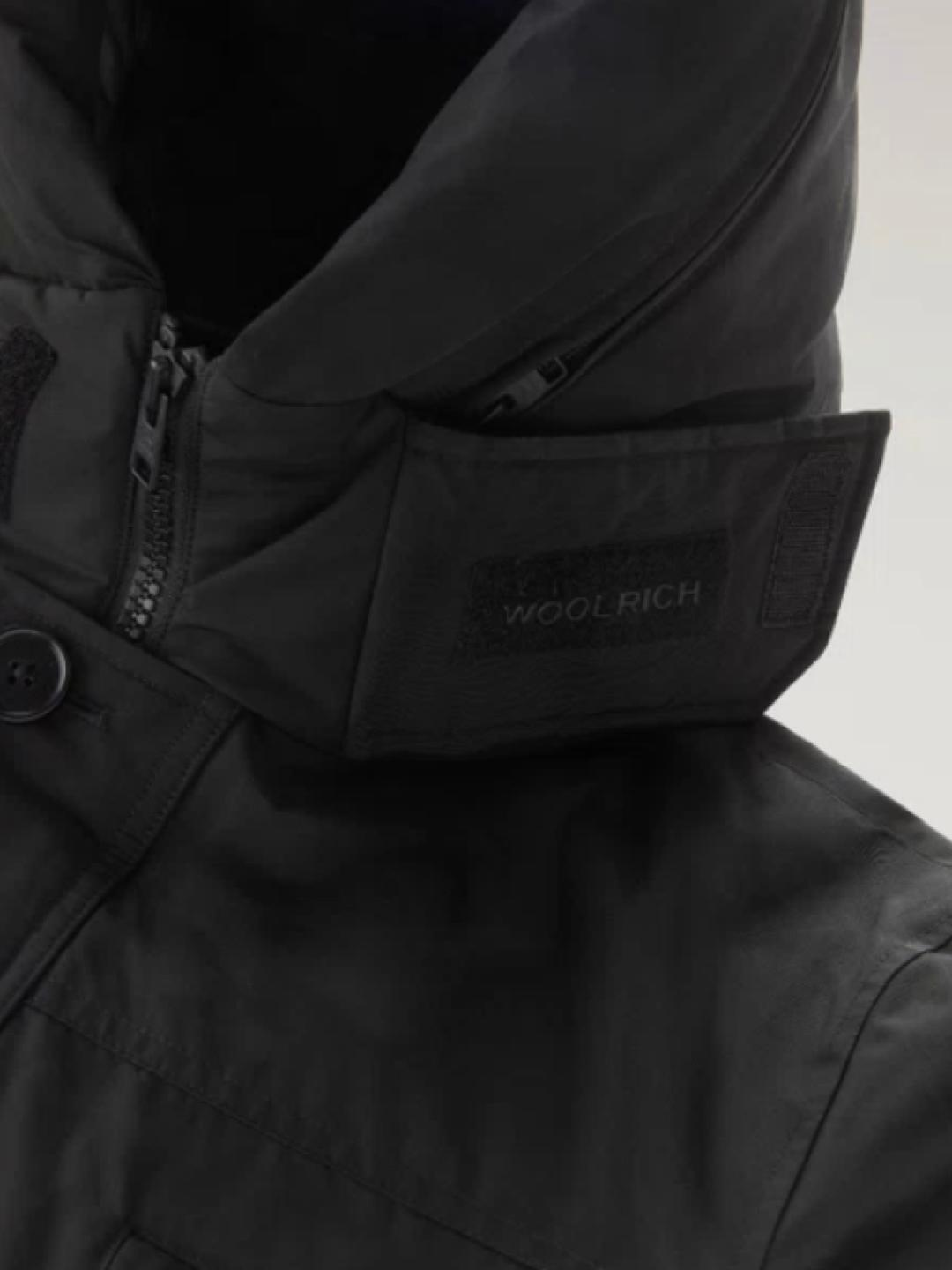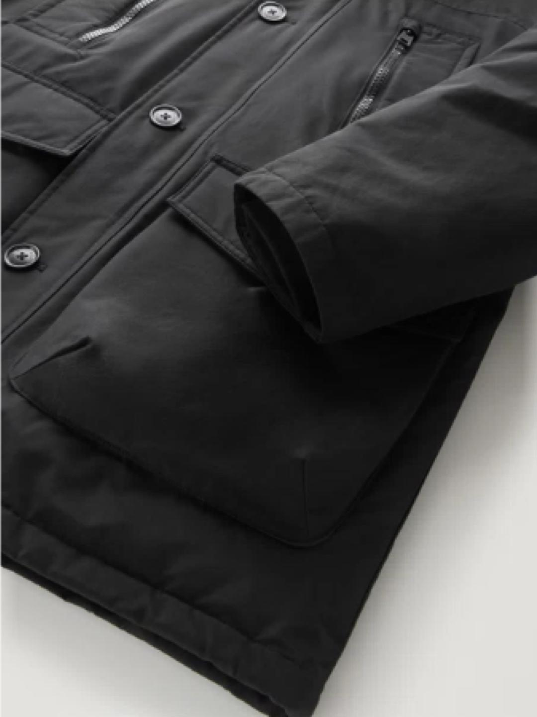 Rivisitazione del nostro iconico Arctic Parka, questa nuova silhouette fa parte della capsule dei 5 Parka che giocano con le linee e i dettagli che hanno reso celebre questo modello, creando un ponte fra tradizione e contemporaneità. Realizzato nel nostro tessuto Ramar Cloth, resistente all'acqua e al vento, è imbottito in piuma d'anatra. Ha la chiusura con bottoni e zip nascosta, il cappuccio con una zip che permette di mostrare o nascondere la scritta Woolrich e una serie di tasche funzionali. Le due tasche superiori sono a doppio ingresso con zip e quelle sul fondo con patta e bottone a pressione. Internamente ha una coulisse per regolare la vestibilità e le due tasche tipiche del modello. I polsini a costine sono un ottimo alleato nelle giornate ventose.