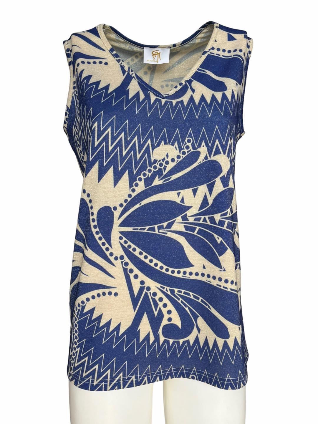 Bellissima canotta in maglina lurex nei toni dell'oro e blu antico con stampa vintage.